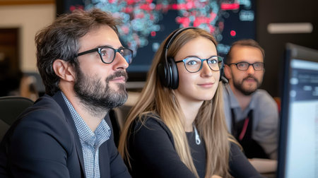 Three men in blue shirts are working on a computer. One of them is wearing a headset. Concept of focus and concentration as the men work on their tasks