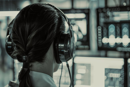 Woman wearing headphones joins Zoom meeting, surrounded by pixelated faces, symbolizing digital work, communication, and tech limitations.