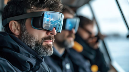 A group of men wearing advanced virtual reality glasses on a boat, showcasing immersive technology and teamwork in engaging marine environments.