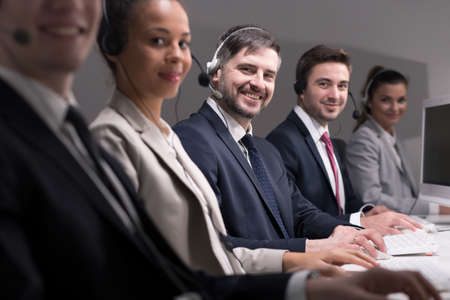 Group of diverse telemarketing customer service staff team in call center. Call center worker accompanied by team. Smiling of customer support operator at work.