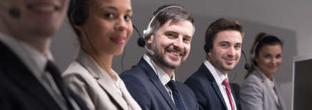 How can I help you? Beautiful call center workers in headphones are working at modern office
