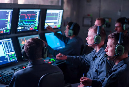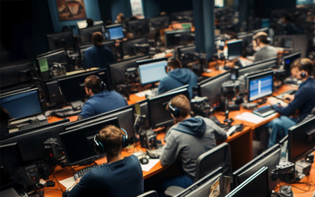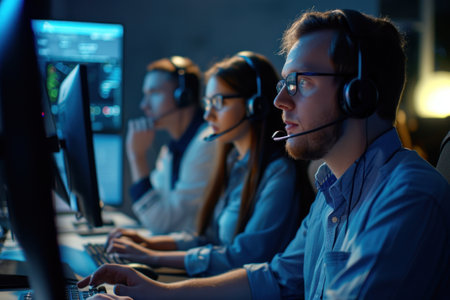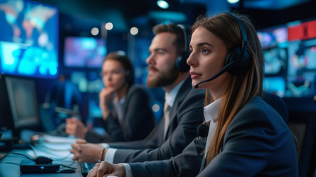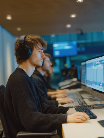 Telecommunications specialists work diligently in a control center, focusing on their screens while ensuring effective communication during evening hours.