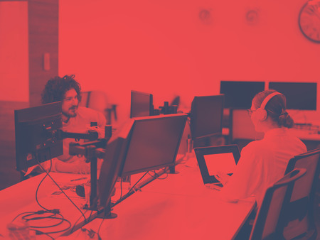 Behind the scene. Film crew in studio for film montage. Analog and digital video editing