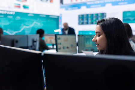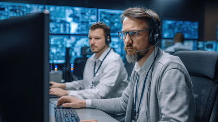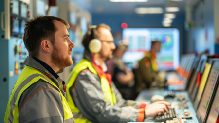 Two skilled technicians are deeply engaged in their tasks in a modern control room. Surrounded by multiple screens, they demonstrate focus and professionalism while monitoring data in a high-tech environment.