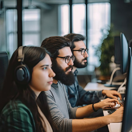 Three men in blue shirts are working on a computer. One of them is wearing a headset. Concept of focus and concentration as the men work on their tasks