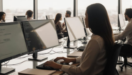 Close up of digital marketing professional working on computers in a collaborative coworking space
