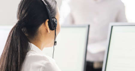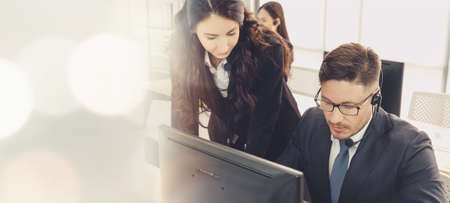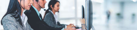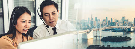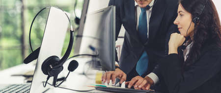 Business people wearing headset working in office to support remote customer or colleague. Call center, telemarketing, customer support agent provide service in broaden view .
