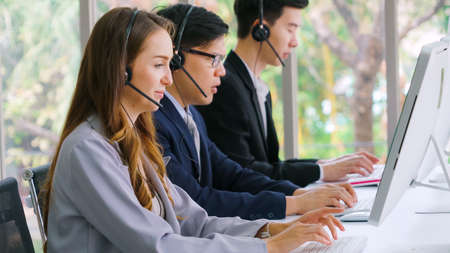 Group of business people wearing headset working actively in office. Call center, telemarketing, customer support agent provide service on telephone video conference call.