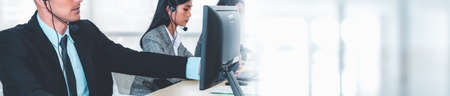Call center or customer support agent in broaden view panorama banner wearing headset while working at office to support remote customer or colleague on telephone video conference call