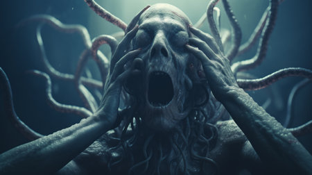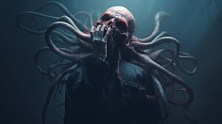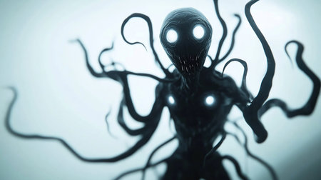 A haunting, dark, humanoid figure with bright, glowing eyes and multiple long, winding tentacles, set against a mysterious, misty background, evoking a sense of dread and the unknown.