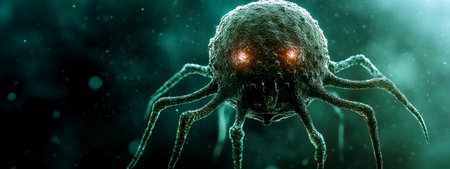 Microscopic view of a virus showing its scary features, such as glowing red eyes and spidery legs, floating in a dark green liquid, possibly representing a dangerous infection