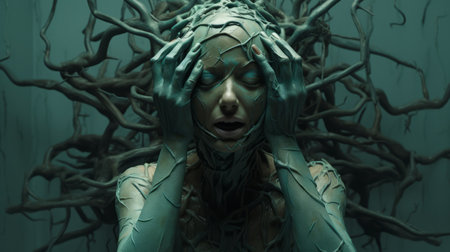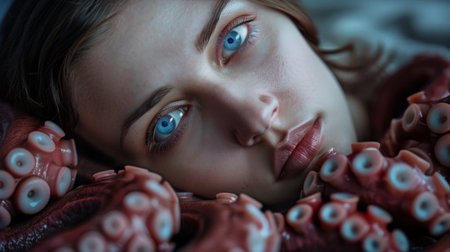 Mysterious blue-eyed woman surrounded by tentacles