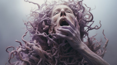 the photo features a shocking image of a lilac old creature with hands on top of its head, portrayed in a hyper-realistic sci-fi style. the white text adds a striking contrast to the grainy and tenebrous background. created by alessio albi using bryce 3d, the minimal retouching enhances the bold and dynamic lines, resulting in a captivating and intense composition. andrew ferez's influence is also