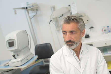 Male doctor working on optometric equipment at clinic