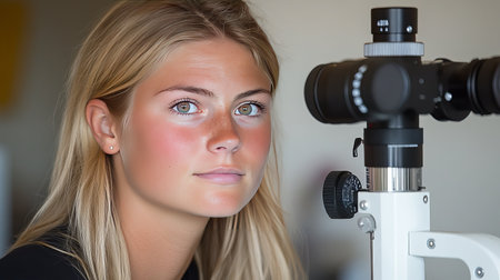 Close-up portrait of a young woman undergoing an eye examination. She is sitting in front of a sophisticated ophthalmic device, focusing on the camera with a calm expression.