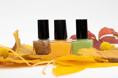 Three nail polish bottles with yellow autumn leaves. Green, brown, yellow nail polish bottles