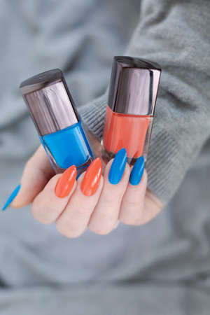 Female hand with long nails and blue manicure with bottles of nail polish