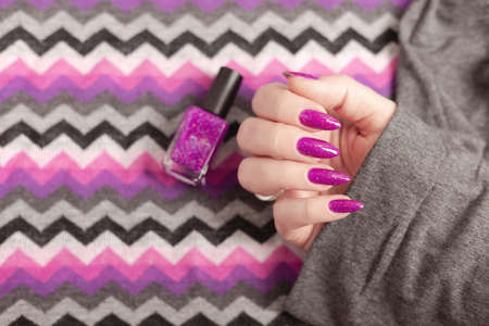 Female hand with purple violet long nails and nail polish bottle