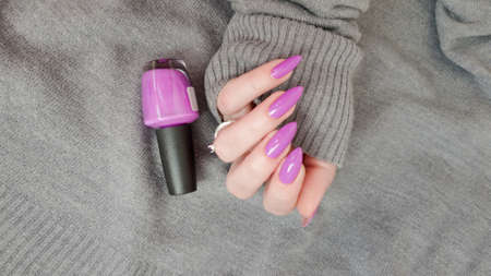 Female hand with lilac purple long nails and nail polish bottle