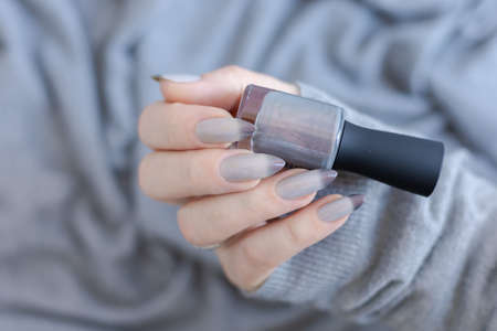 Female hand with long nails and a gray manicure holds a bottle of nail polish