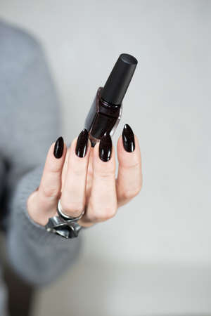 Female hand with long nails and black manicure holds a bottle of nail polish