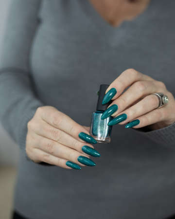 Female hand with long nails and dark blue teal manicure holds a bottle of nail polish