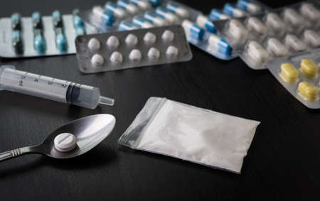 Cocaine, amphetamine and focus at the disposable syringe on a black background. Narcotics addiction.