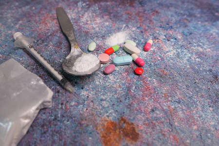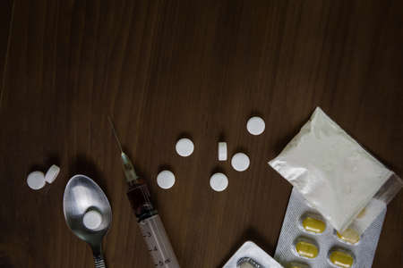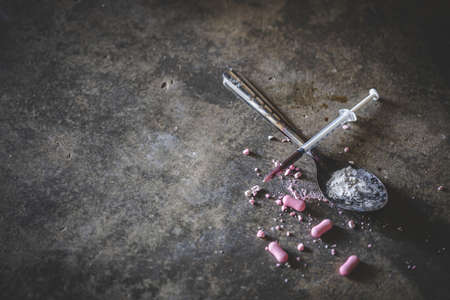 Drugs in the form of white powders and syringes on the floor. Anti drug. Drug concept.