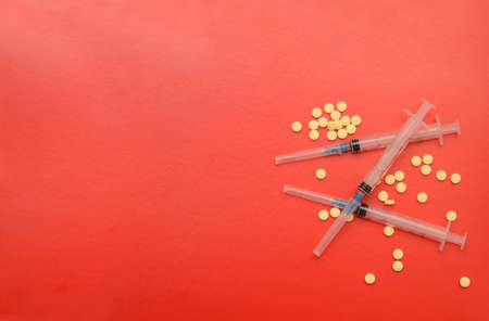 Medical background copy space, flat lay. Syringes and yellow pills on a red background.