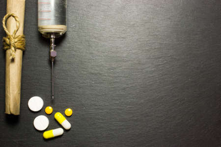 Medical syringe and pills on dark background