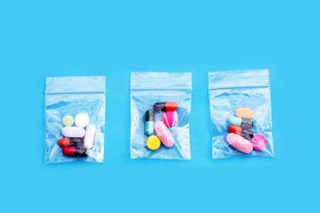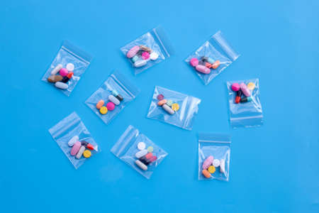 Colorful tablets with capsules and pills in medicine plastic zip lock bags on blue background. Top view