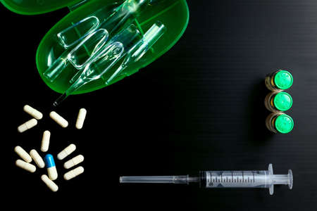 Medical accessories, syringe, pills, capsules, ampoules, black background.