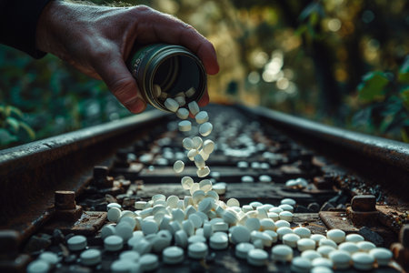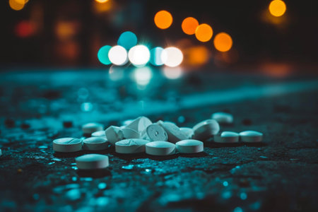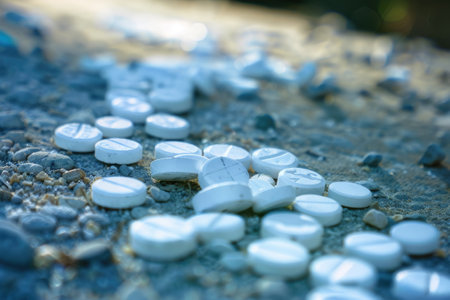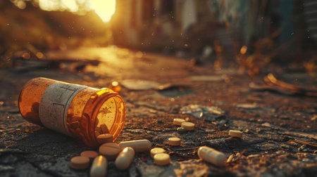 A collection of pills discarded on the side of a road, highlighting the issue of proper medication disposal, The contrast between the beauty and danger of opioids, AI Generated