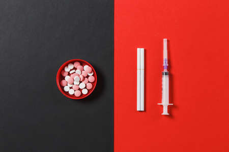 Medication colorful round tablets pills, empty syringe needle, cigarettes on black red background. Treatment choice healthy lifestyle. Copy space for advertisement. With place for text