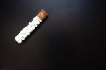 Jordan almonds on glass tube. Wedding decoration on black background. Confetti food