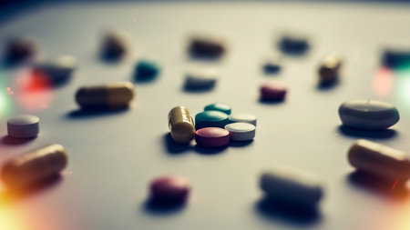 Pills scattered on the table. Blurred background, focus on foreground.