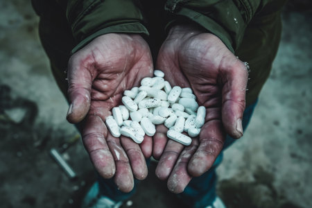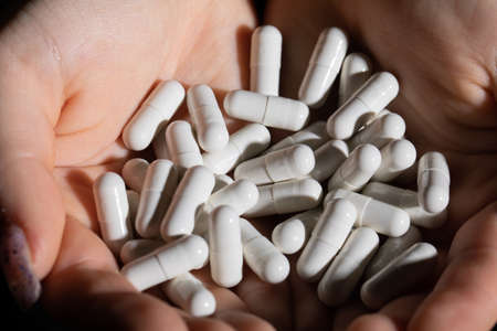 Drugs in the hands of an addict, close up. Addiction concept.