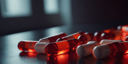 Red pills on a black background. Close-up. Focus on foreground.