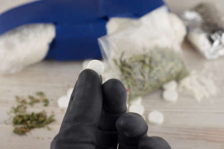 cocaine, heroin, spice, marijuana and etc - lots of unknown pills, white powder in a transparent package and the foil and similar to the spice mixture, hand in a black glove holding a single pill