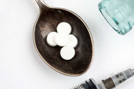 Medications and pills with spoon and syringe on a white background