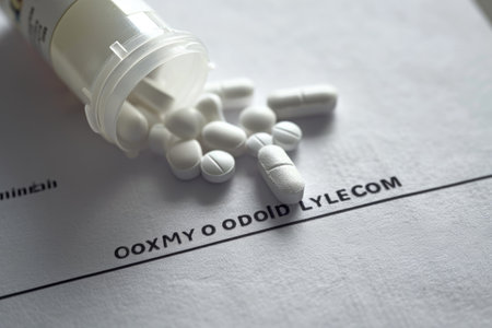 A detailed close up of a prescription bottle and pills, featuring a visible label and dosage instructions, Prescription pad with the word 'OXYCODONE' written on it, AI Generated