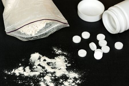 Drugs on black background. Narcotic drugs addicted.