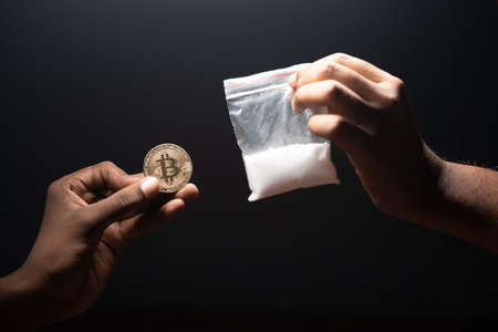 Maski, India - 26 November, 2021 : Concept showing misuse of Cryptocurrency, using bitcoin to purchase durgs or illegal substance.