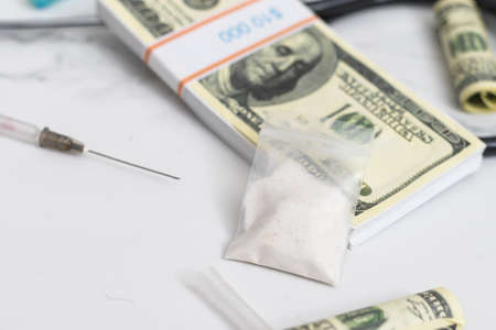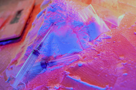 Drugs, drug dealer house. Cocaine packaged in sachets, scales: tablets and syringes in neon light. Illegal, entry.