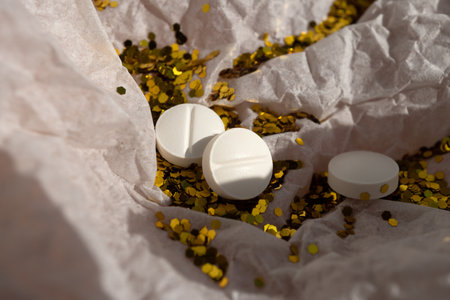 White pills and glitter lie on white packaging paper.