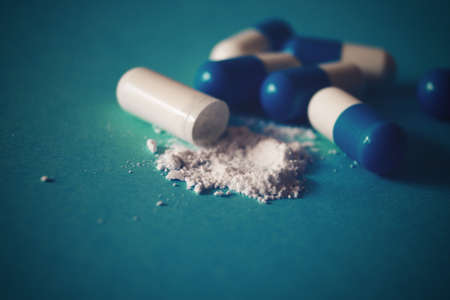 Pills and powder on a blue background. Selective focus.