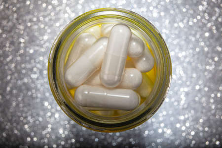 Macro Photo of White Pills In Yellow Glass Jar. Close up Photo of Pills On Silver Pentagram Bokeh Background. With Copy Space.