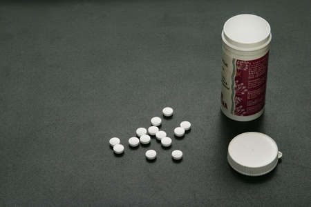 White and orange pills on a dark concrete table