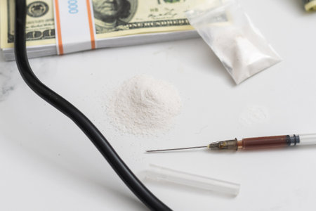dangerous business - drug laboratory: white powder, syringes and money