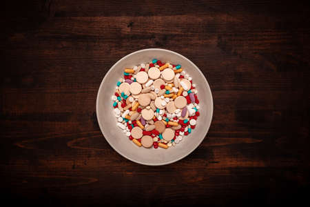 Plate full of tablets, pills and capsule medication - top view flat lay arrangement